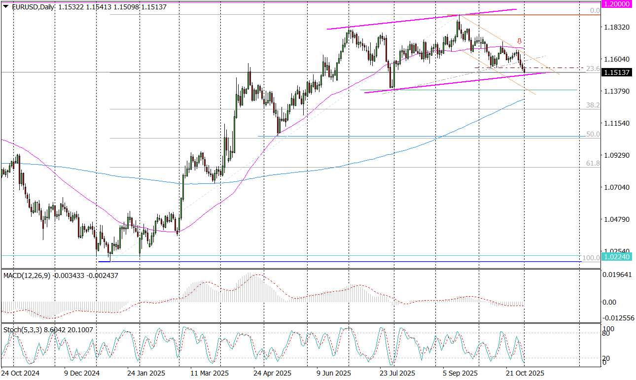 Spadek kursu EUR/USD poniżej dołka z pierwszej połowy października (1,1542), przebicie linii wsparcia łączącej ten dołek z dołkiem z wakacji, a także podażowe sygnały na wskaźnikach, mogą zapowiadać dalsze spadki.